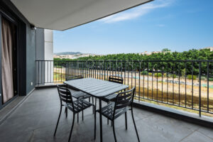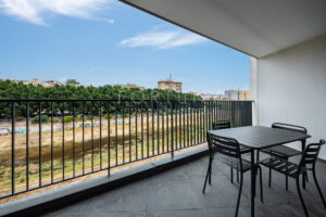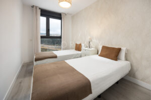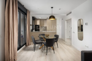 The apartment is south-east facing and has a built area of 96m2 including common areas, 65m2 built area of the home, 61m2usable area, and a large 14m2 terrace with city and river views, overlooking a major remodelling project intended to make the area more attractive and enjoyable for the city. It is distributed into an entrance hall, a spacious and bright living-dining room with access to the terrace, an open-plan American kitchen fully furnished and equipped, which opens onto the living room. It features two bedrooms with built-in wardrobes. The main bedroom includes an en-suite bathroom, and the second full bathroom serves the rest of the rooms.