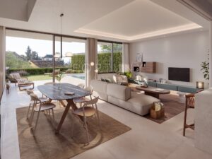 The outdoor areas are designed for enjoying the Mediterranean climate. They feature a spacious terrace with outdoor dining area, a 48m2 artificial grass garden and a private pool.