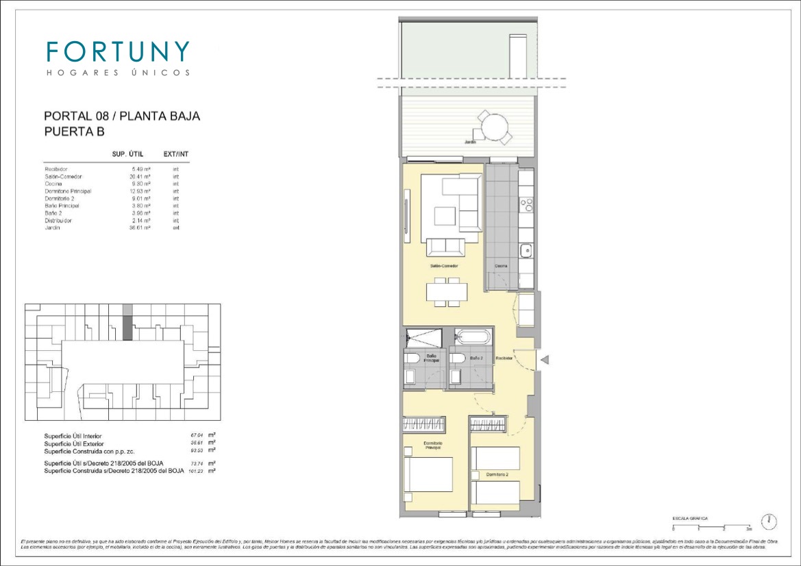 This north-facing ground-floor apartment consists of 92m2 built area, 67m2 usable area, and 39m2 of garden and terrace. It is distributed into an entrance hall, a spacious and bright living-dining room with access to the terrace and garden, an American-style kitchen fully furnished with high and low cabinets, two bedrooms with built-in wardrobes (the main bedroom features an en-suite bathroom), and a second full bathroom serving the rest of the rooms.
