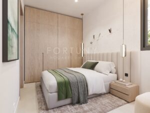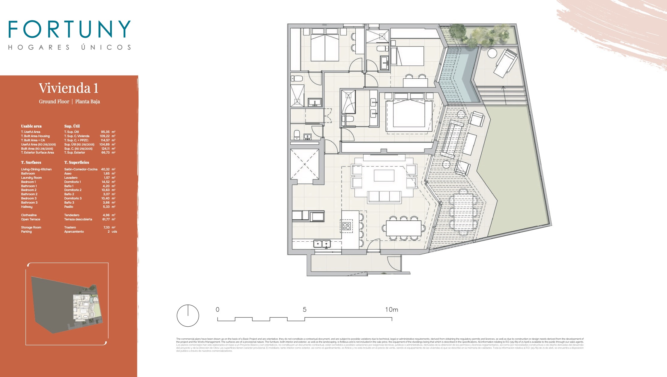 El bajo está orientado al sureste, consta de una superficie total construida de 100m2 incluidas las zonas comunes, 95m2 útiles de vivienda y 66m2 de terraza descubierta. Se distribuye en un amplio salón-comedor con salida a la amplia terraza con piscina privada, zona chill-out y comedor al aire libre, una cocina americana totalmente amueblada, un pasillo distribuidor, un aseo de cortesía y tres dormitorios con armarios empotrados y cuartos de baño en suite.