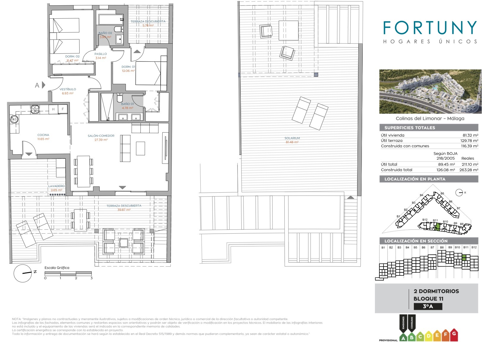 Este exclusivo ático tiene una superficie total construida de 116m2 incluidas las zonas comunes, 81m2 útiles de vivienda, una terraza descubierta de 40m2 y un solárium de 81m2.