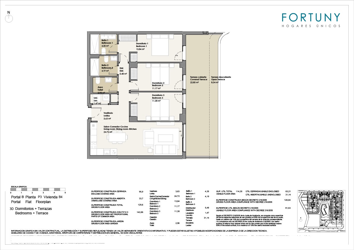 El piso con orientación oeste, consta de 95m2 construidos de vivienda, 83m2 útiles, una terraza cubierta de 22m2 y terraza descubierta de 9m2.